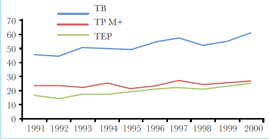En conséquence, les tuberculoses extra-pulmonaires représentent un pourcentage croissant de toutes les formes de tuberculose atteignant près de 65 % d’entre elles alors qu’elles ne franchissaient pas les 17% en 1962, 23% en 1982 et 38% en 2002 (figure 4).