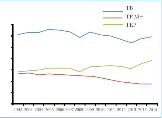 Durant le début des années 2000 et après un plan de relance du Programme National de lutte contre la tuberculose, on constate une augmentation plus marquée des incidences déclarées notamment celle de la tuberculose extra-pulmonaire. L’augmentation se poursuit sauf pour l’incidence de la tuberculose pulmonaire, qui régresse à partir de l’année 2005 et décline pour la première fois sous le seuil de 17 cas pour 100.000 habitants en 2015. Durant cette période, l’incidence annuelle des cas de tuberculose extrapulmonaire déclarés augmente, rejoignant en 2000 la courbe d’incidence des cas de tuberculose pulmonaire à microscopie positive puis la dépasse pour atteindre une incidence considérable de 38,4 cas pour 100.000 habitants en 2015. (Figure 3)