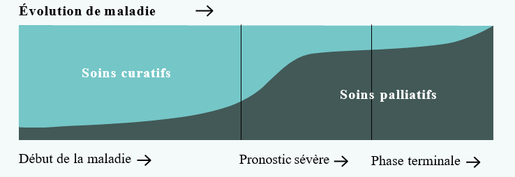 À quels moments de la maladie ? Les soins palliatifs ne sont pas réservés aux malades en fin de vie. Ils sont mis en place au cours de différentes périodes de la maladie. Peuvent être pratiqués tôt dans la maladie, pour aider à mieux la vivre et pour anticiper les difficultés qui pourraient survenir. Ils sont alors associés à des traitements dont l’objectif est de guérir ou de ralentir l’évolution de la maladie (chimiothérapie, radiothérapie, etc.). Enfin, lorsque l’évolution de la maladie est inéluctable et que le décès se rapproche, les soins palliatifs deviennent une priorité.