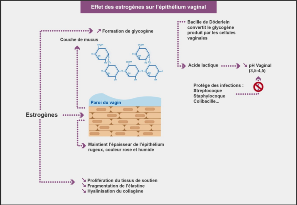 Les œstrogènes ont un rôle majeur dans l’hydratation et la prolifération de l’épithélium vaginal. Ils ont un effet trophique direct sur le tissu conjonctif et les fibres élastiques. La baisse des œstrogènes est à l’origine de l’atrophie vaginale ; le vagin perd son élasticité et devient étroit et peu profond (5).