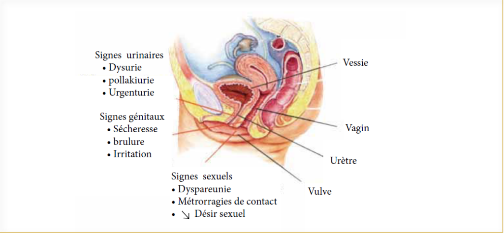 Le GSM dépasse le concept de la carence ostrogénique pour inclure les symptômes en rapport avec le vieillissement qui sont représentés par les symptômes vulvo-vaginaux (sécheresse, brûlures, irritation), les symptômes sexuels (dyspareunie) et les symptômes urinaires (urgenturie, infection urinaire à répétition, prolapsus…). Les symptômes liés à ce syndrome sont en augmentation depuis le déclin du traitement hormonal de la ménopause en rapport avec les conclusions de la WHI (Women’s Health Initiative) sur les risques cardiovasculaires et carcinologiques mis en exergue dans cette étude randomisée.