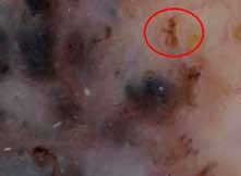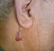 Les lésions sont des papules ou des nodules érythémateux fixes, parfois multiples mais alors le plus souvent regroupés dans une même région cutanée. Les localisations préférentielles sont l’extrémité céphalique et le tronc (Photos 5 et 6).