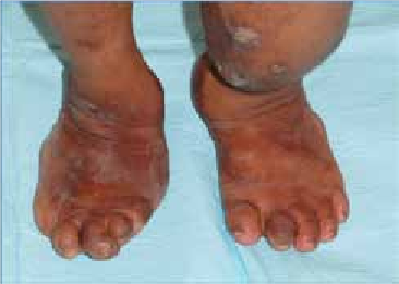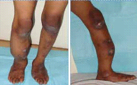 Les lésions sont des tumeurs rouges violacées, d’évolution rapide vers des dimensions parfois supérieures à 10 cm et souvent ulcérées. Uniques ou multiples. La localisation typique, justifiant l’appellation actuellement admise, est le membre inférieur, mais d’autres régions cutanées peuvent être concernées (Figures).