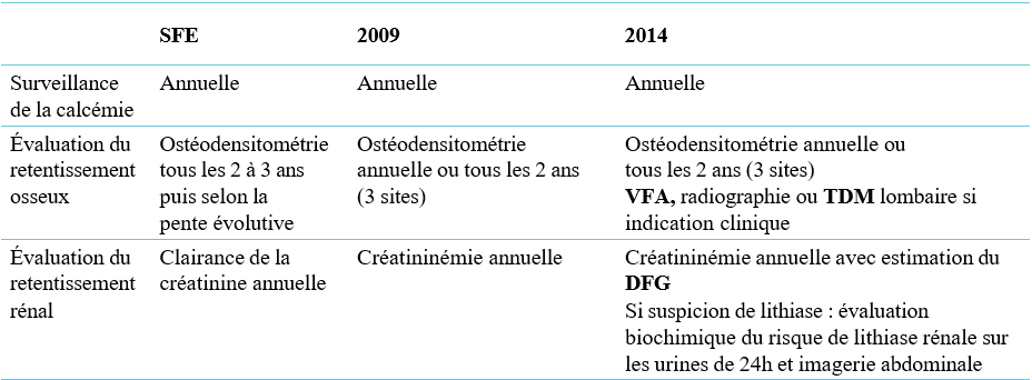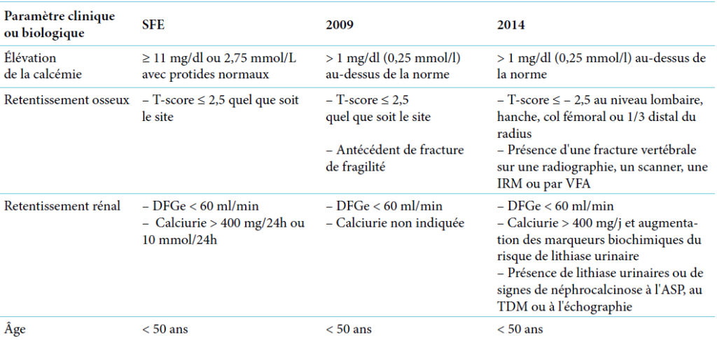 (IRM : imagerie par résonnance magnétique, VFA : vertebral fracture assessement, DFGe : débit de filtration glomérulaire estimé, ASP : radiographie de l’abdomen sans préparation, TDM : tomodensitométrie) Tableau 2 : Indication de prise en charge chirurgicale devant une hyperparathyroïdie primaire asymptomatique : recommandations en 2014, 2009 et de la SFE EN 2005.(SFE : Société française d’endocrinologie, DFG : débit de filtration glomérulaire, VFA : vertebral fracture assessment, TDM : tomodensitométrie) Tableau 3 : Surveillance des patients ayant une HPTP asymptomatique non opérée.