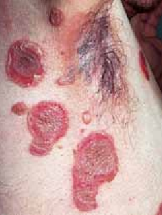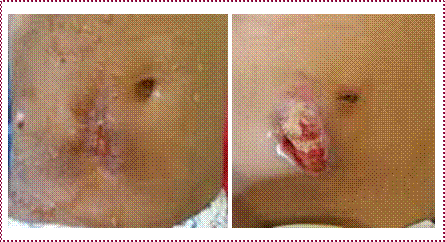Cicatrice dégénérée post brûlures : la dégénérescence cicatricielle est une éventualité qu’il faut connaitre. Toute ulcération récidivante ou permanente survenant sur les cicatrices anciennes (20-30 ans) ou les cicatrices soumises à des traumatismes par étirement est néoplasique jusqu’à preuve du contraire (figure 11).