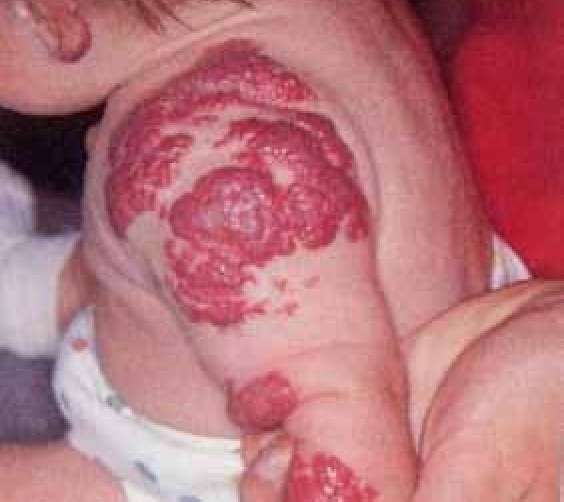 – La forme tubéreuse ou superficielle (figure 1) qui correspond à une tache rouge, saillante, à surface irrégulière et à bords nets communément appelée angiome « fraise ».