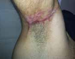 Figure 5 : Cicatrice hypertrophique post brûlure thermiqueFigure 6 : Cicatrice hypertrophique axillaire droite post traumatique