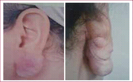 Figure 12 : Cicatrice chéloïde du lobe de l’oreille après presso thérapie rigide des clips
