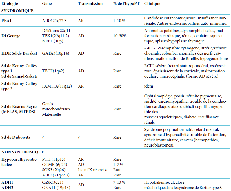Sd : syndrome ; AR : autosomique récessif ; AD : autosomique dominant ; ADH : autosomal dominant hypoparathyroïdisme.