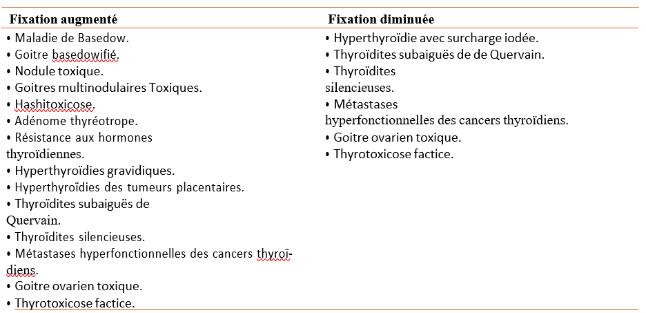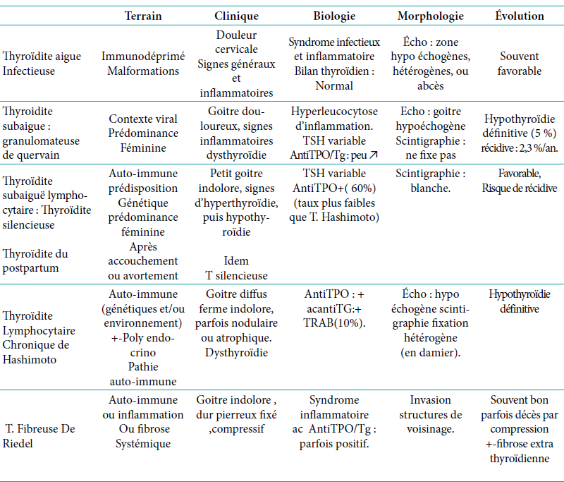 - Secondaire à la destruction des glandes : lors d’irradiation cervicale externe, traitement par l’iode radioactif, infiltration granulomateuse (tuberculose, sarcoïdose), néoplasique (métastases d’un cancer), fibro-inflammatoire (thyroïdite de Riedel), maladie de surcharge (Wilson et hémochromatose).