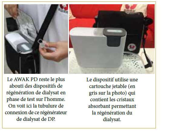 Il s’agit de l’acronyme de « Wearable Artificial Kidney for Peritoneal Dialysis ». Développé par la AWAK Technologies d’origine singapourienne, il s’agit d’un appareil portatif permettant la réalisation de séance de DP de 8h en toute mobilité. La technique consiste à remplir le péritoine du patient avec 1 à 2 l de dialysat, puis de le connecter au dispositif portatif qui va effectuer la filtration de 500 ml de dialysat toutes les 7 minutes (soit 8 cycles de régénération par heure).