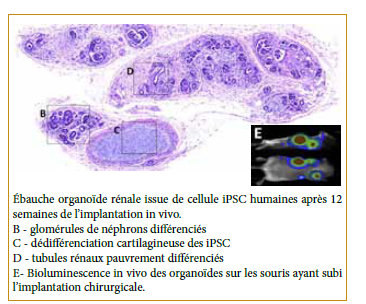 Bantounas et al. (U. Manchester, UK), ont également publié leurs travaux dans le domaine de l’organogenèse. Dans leurs publications de Mars 2018 [11], ils décrivent l’utilisation de cellules souches humaines induites (iPSC), cultivées par des procédés de différentiation cellulaire en lignées rénales. Ils utilisèrent la même procédure que celle proposée par Taguchi et al. pour développer un organoïde rénal. Puis ils procédèrent à l’implantation de ces organoïdes dans le tissu sous cutané de souris immunodéficientes. Après 12 semaines de suivi, ils constataient le développement des organoïdes vers des structures possédant des glomérules (certains étaient capables d’ultrafiltration), drainés par des pseudo-tubules. Ces résultats exceptionnels nous font entrevoir un futur où des organes humains pourraient être « cultivés » ou portés par des animaux d’élevage à but de remplacement d’organe. Toutefois, même si ces études démontrent la faisabilité conceptuelle d’une telle