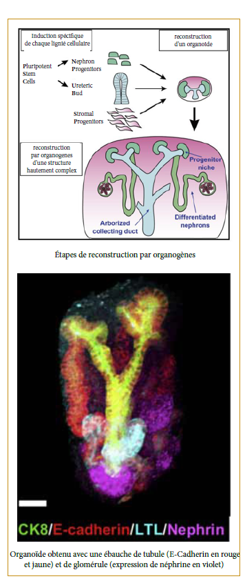 La reconstruction d’un tissu fait d’un seul type cellulaire est connue depuis de nombreuses années. Toutefois, pour la reconstruction d’un organe complexe, comme le rein, il n’est pas envisageable de simplement mettre en co-culture des précurseurs cellulaires et espérer les voir spontanément s’organiser pour former l’organe souhaité. Pour remédier à cet écueil, plusieurs méthodes sont à l’essai, allant du bioprinting 3D à la reconstruction d’un embryon complet ou non. L’équipe de Taguchi, de l’université de Kumamoto au Japon, a publié en 2017 des travaux accueillis comme une percée majeure dans le domaine de la reconstruction d’organe. Il réalise la mise en culture et le développement séquentiel d’un bourgeon néphronique in vitro. À partir de cellules issues de bourgeon urétéral et blastème métanéphrogène d’embryon de souris, ils réussirent à identifier les facteurs de croissance nécessaires au développement de ces cellules et à maintenir la survie et l’organogenèse de ces cellules vers la formation d’une structure complexe. Ils réussirent donc à développer in vitro un « Organoïde » rénal [10].