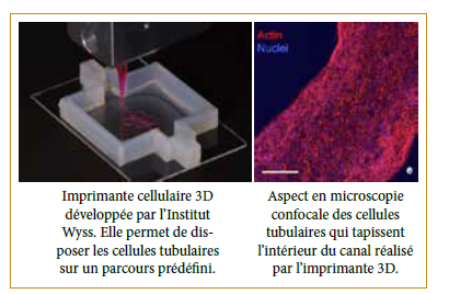 Un début de solution fut apporté par le département de Bio-engineering de Wyss (Harvard University). Humes et al ont publié en 2016, un procédé d’impression 3D de cellules tubulaires permettant d’obtenir in-vitro une structure similaire à un tubule néphronique, composé de cellules tubulaires polarisés présentant une activité proche de celle des cellules in-vivo [8]. Cet exploit permet d’imaginer la survie de structures tubulaires recouvertes de cellules tubulaires dans ce qui sera peut-être le premier rein artificiel implantable.
