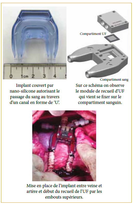 La mise en place d’un dispositif implantable doit répondre à plusieurs impératifs. Le premier d’entre eux reste la capacité du versant sanguin du dispositif à ne pas thromboser une fois implanté. Cela, même en l’absence d’une anticoagulation systémique pharmacologique. Les nanotechnologies viennent ici à la rescousse des patients en proposant l’utilisation de membrane en nano port de silicone. Les premiers essais de mise en place chirurgicale d’un dispositif d’ultrafiltration non-thrombotique chez l’animal ont eu lieu avec succès en