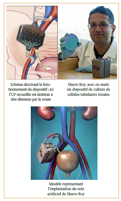 L’équipe de bio-ingénierie de UCSF, avec à sa tête Shuvo Roy, œuvrent actuellement au développement d’un dispositif implantable constitué de deux compartiments. Le premier compartiment (dit « HemoCartridge »), permet la formation d’UF à partir du sang (déjà développé pour l’équipe de Kensinger et Al). Le second (dit « Bio- Cartridge ») devrait permettre, à l’aide de cellules tubulaires en culture, de récupérer les éléments nutritifs de l’UF et de les restituer au sang. Mais également de concentrer l’UF recueillie qui est destinée à être éliminée dans la vessie afin de réduire les pertes liquidiennes [7].