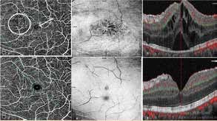 Il a été démontré que les principaux changements détectés par l’OCT-A étaient la non-perfusion capillaire rétinienne, les vaisseaux capillaires péri-fovéaux raréfiés, dilatés ou shuntés, la désorganisation de l’architecture normale du réseau capillaire, l’élargissement de la zone avasculaire centrale et la réduction de la capillarité (15).