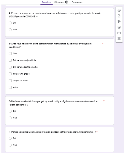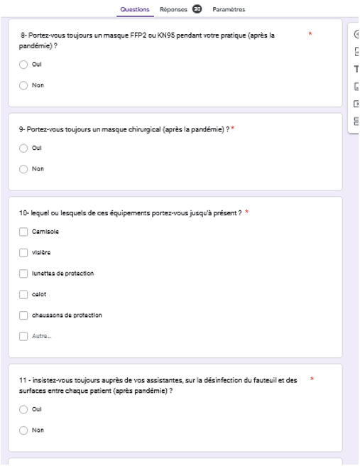 Le formulaire comporte 23 questions (figure 2) dont les réponses analysées nous ont permis de comparer les fréquences de plusieurs variables, avant et après COVID-19.
