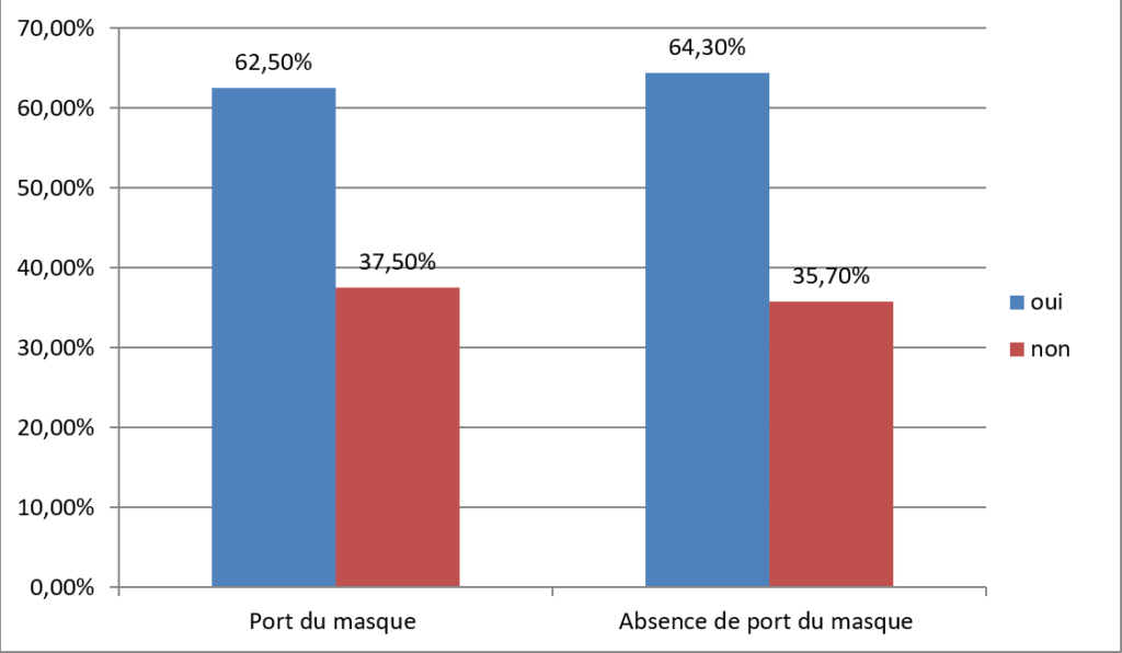 - Le croisement entre le port du masque et le taux d’infections respiratoires hautes révèle un pourcentage de 37,5 % du personnel qui portaient le masque et qui n’ont pas développé d’infections respiratoires avant la COVID-19 (Figure 4, Tableau3).