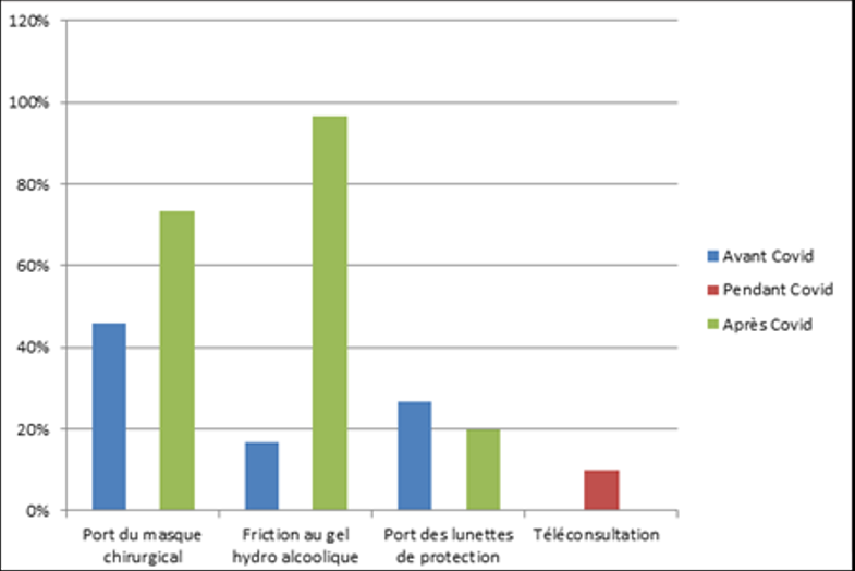 73.3% des personnes interrogés avaient déclaré toujours porter un masque chirurgical pendant l’exercice de leur profession(après la pandémie), 46.6 % une surblouse, 3.3% une visière, 20% des lunettes de protection et 3.3 % un calot.