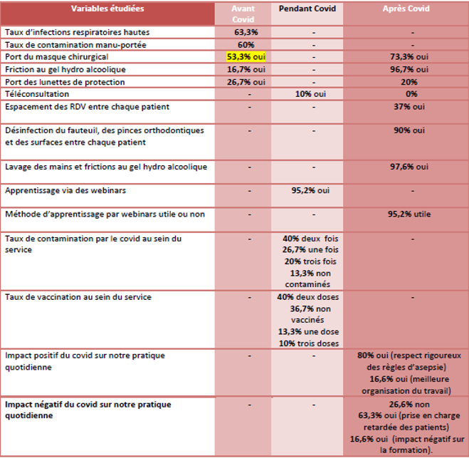 Enfin, notre étude au sein du service d’ODF du CHU de Béni Messous a été concluante quant à l’impact positif qu’a eu la COVID sur le respect rigoureux des règles d’asepsie et l’organisation des tâches au quotidien selon 96,6% des sujets interrogés.