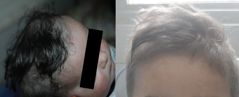 L’AOC peut être présent dès la naissance, et concerner les trois organes ou certains d’entre-deux, total ou partiel ou même être absent (12). Parfois une hyperpigmentation comme chez l’un de nos patients peut exceptionnellement être vue, faisant retarder le diagnostic (13,14). La plupart des patients présentent une photosensibilité. Certains patients ont un phénotype atypique avec une forme atténuée où l’AOC est subtile, voire absent, et qui sont probablement méconnues (11,15). Rarement d’autres lésions cutanées sont observées comme une hyperhydrose, un érythème polymorphe.