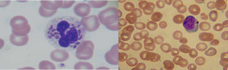 Fig.4 Frottis sanguin : granulations géantes au niveau des leucocytes et lymphocytes (In Indian J Hematol Blood Transfus (Sept 2014) 30(Suppl 1):S223–S226)